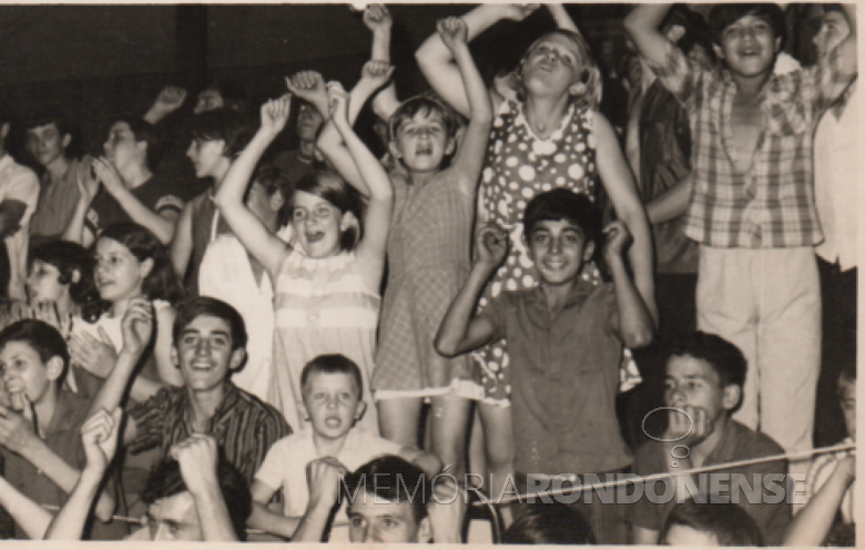 Instantâneo de estudantes comemorando a vitória de seu grêmio estudantil numa das competições dos Jogos.