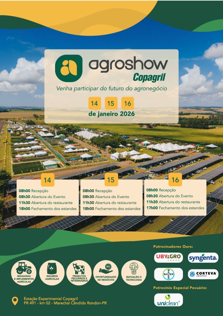 2026 — Começa e segue até o dia 16, o Agroshow Copagril, 2ª edição, antes Dia de Campo Copagril, da Cooperativa Agroindustrial Copagril, com sede central na cidade de Marechal Cândido Rondon (PR) (Tribuna do Oeste. Tecnologia e Inovação. Marechal Cândido Rondon: ano VIII, nº 393, ed. 15 de janeiro de 2025, p. 1 e 9. -- FOTO 16 --