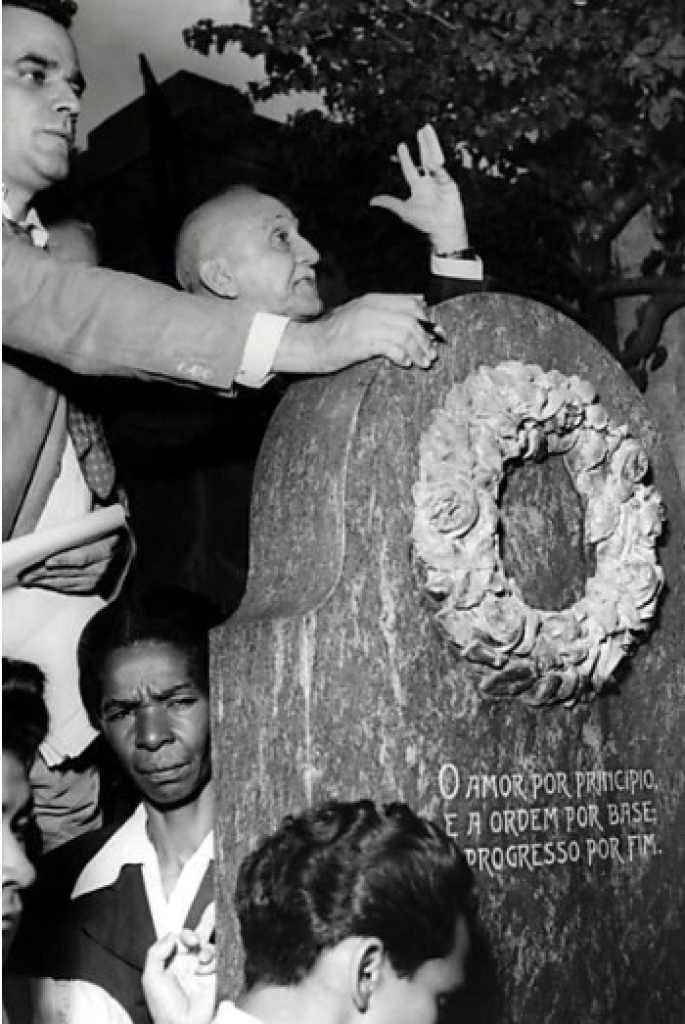 Na lápide vê-se a inscrição: "O amor por princípio. E a ordem por base. O progresso por fim".