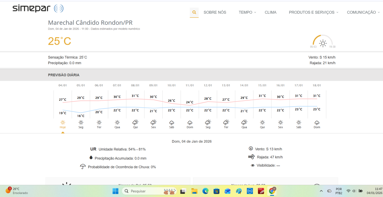 2026 — É domingo. O começo da manhaã na cidade de Marechal Cândido Rondon (PR) tem temperatura de 23 graus. Ventos do quadrante Leste, brisa. Céu sem nebulosidade.