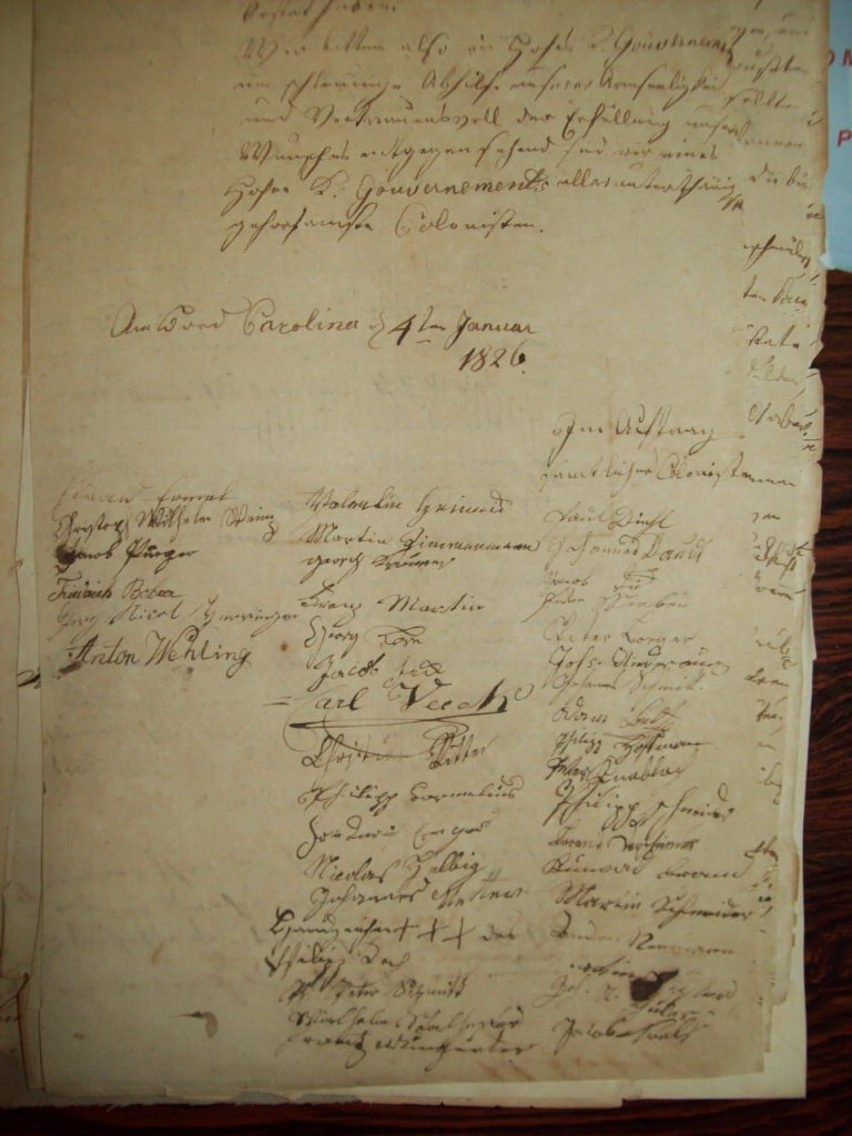 A pesquisa feita do documento conseguiu identificar os 40 imigrantes peticionários: Ewald Ermel, Christoph Wilhelm Weinz, Jacob Purper, Friedrich Bohrer, Georg Nic. Herrringer, Anton Wehling, Valentin Heinek, Martin Zimmermann, Georg Krämer, Franz Martin, Georg Lore. Jacob Feeck, Carl Veeck, Christian Ritter, Philipp Cornelius, Friedrich Engers, Nicolaus Helbig, Johannes Vetter, (xxx) Philipp Koch, Ph. Peter Schmitt, Wilhelm Stahlhofer, Franz Weingertner, Paul Diehl, Johannes Daudt, Jacob Dick, Peter Sieben, Peter Borger, Johannes Niederauer, Johannes Schmidt, Adam Belz/Pelz, Philipp Hoffmann, Peter Knobloch, Philipp Schneider, Lorenz Dexheimer, Konrad Brand (t), Martin Schneider, Johannes Niederauer (pai), Martin Huster, Joh. N. Schuler e Jacob Krebs.