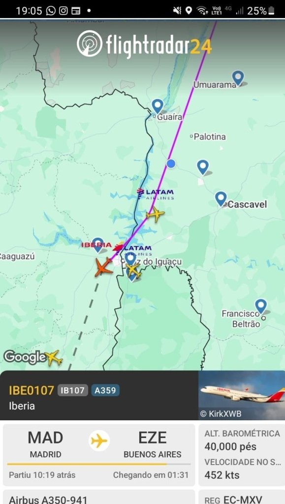 Por volta das 18:30 horas, uma aeronave da empresa espanhola Iberia cruza o espaço aéreo de Marechal Cândido Rondon ao realizar o voo Madrid a Buenos Aires.