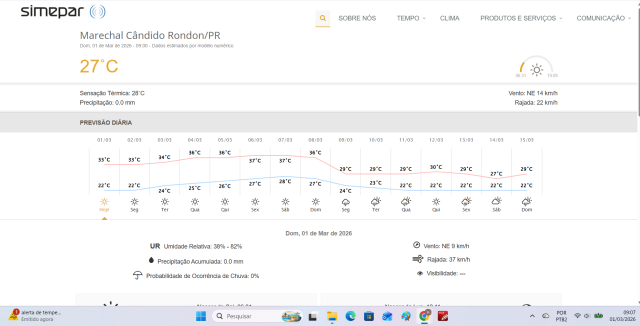 2022 — Persiste a longa estiagem no Oeste do Paraná e leste da República do Paraguai e porção meridional do Mato Grosso do Sul, nesta terça-feira de Carnaval. Em Marechal Cândido Rondon as temperaturas são elevadas, entre 27 e 41 graus. Ventos do quadrante Noroeste, moderados, persistentes até o começo do final da tarde.