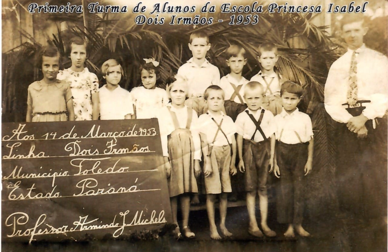 1953 — Começa a funcionar a Escola Municipal Princesa Isabel¹, na então vila de Dois Irmãos, município de Toledo (PR). Assume como professor Armindo José Michels.