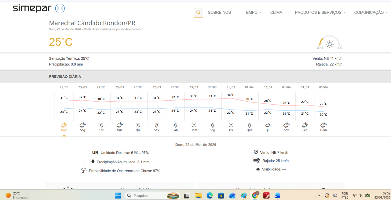 2022 — A terça-feira é de tempo bom em Marechal Cândido Rondon e no Oeste do Paraná, com temperaturas médias entre 21 e 29 graus. Com nebulosidade esparsa e ventos do quadrante Nordeste, moderados (nota do pesquisador).