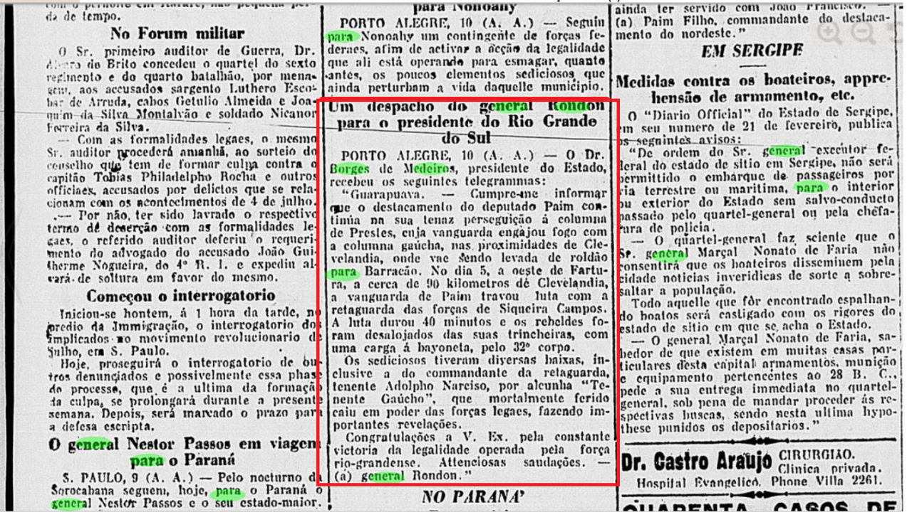 1925 — Nesta data o general Rondon, comandante supremo das forças combatentes aos revoltosos paulistas e gaúchos, envia mensagem telegráfica desde Guarapuava para o governador gaúcho, Borges de Medeiros, informando que a guarnição comandada por Firmino Paim Filho combateu a "Coluna Prestes", nas proximidades de Clevelândia (A Noite. Os acontecimentos militares: um despacho do general Rondon para o presidente do Rio Grande do Sul. Rio de Janeiro: ano XV, nº 4774, ed. 10 mar. 1925, p. 7 — Biblioteca Nacional Digital).
