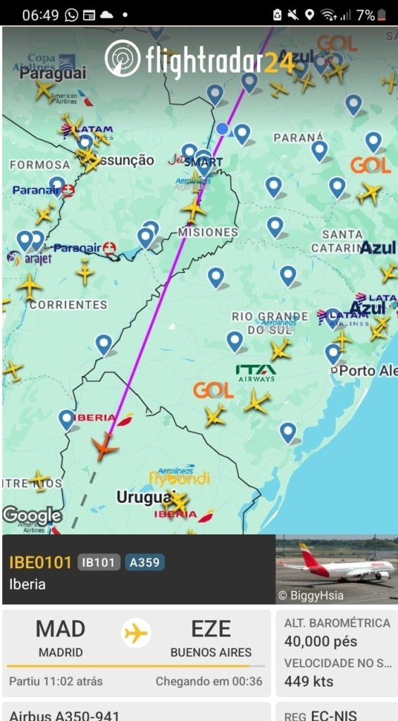 Por volta das 05:45 horas, um avião da empresa espanhola Iberia cruza o espaço aéreo de Marechal Cândido Rondon ao fazer a rota Madrid a Buenos Aires.