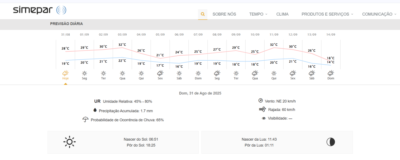 Sobre as condições do tempo no Estado do Paraná, nesta data, o Sistema de Tecnologia e Monitoramento Ambiental do Paraná (SIMEPAR) compartilha a seguinte nota informativa em sua página na internet:
