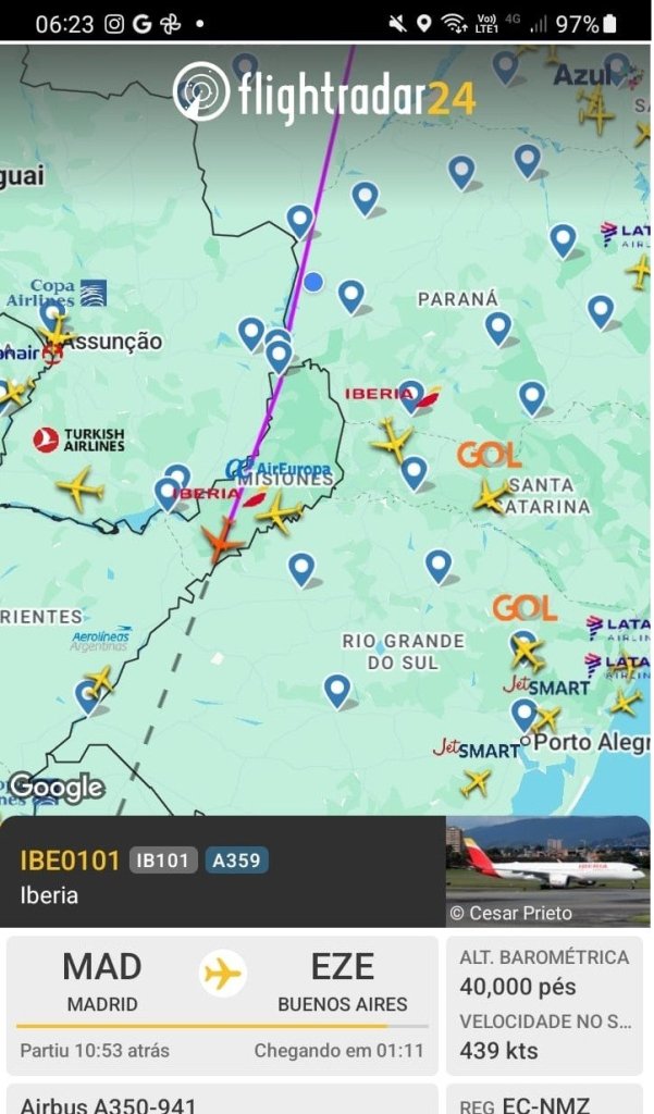 Por volta das 06:00 horas, um avião da empresa espanhola Iberia cruza o espaço aéreo do município de Marechal Cândido Rondon (PR), ao realizar o vôo entre a capital da Espanha, Madrid, e Buenos Aires, capital da Argentina.