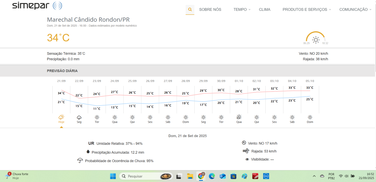 2025 — É domingo. O amanhecer na cidade de Marechal Cândido Rondon (PR) tem temperatura de 22 graus. Ventos do quadrante Nordeste, brisa, depois moderados e a meia-tarde para fortes (de curta duração). Em seguida voltando a condição de moderados. Céu sem nebulosidade. A partir da meia-manhã avistamento de nuvens tipo cumulonimbus ao setor sudoeste do município de Marechal Cândido Rondon.