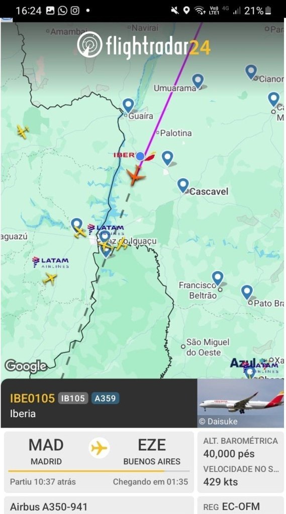 Outra aeronave da empresa espanhola cruza o espaço aéreo de Marechal Cândido Rondon, por volta das 16:15 horas, ao fazer o vôo da mesma rota.
