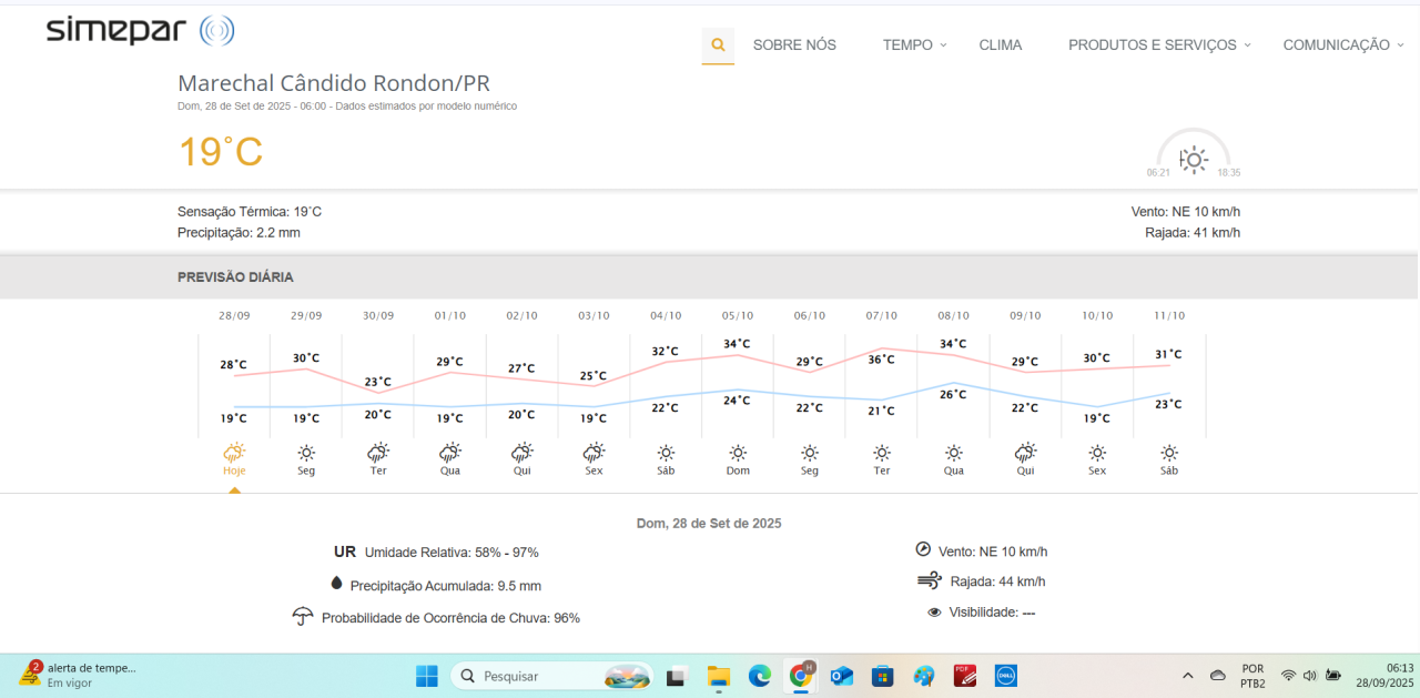 2025 — É domingo. O amanhecer na cidade de Marechal Cândido Rondon (PR) tem temperatura de 18 graus. Ventos do quadrante Nordeste, brisa, depois fracos, persistentes até o começo do final da tarde. Céu parcialmente encoberto como nebulosidades tipificadas como nimbostratus e altocumulus. Ocorre precipitação pluviométrica leve durante a madrugada.