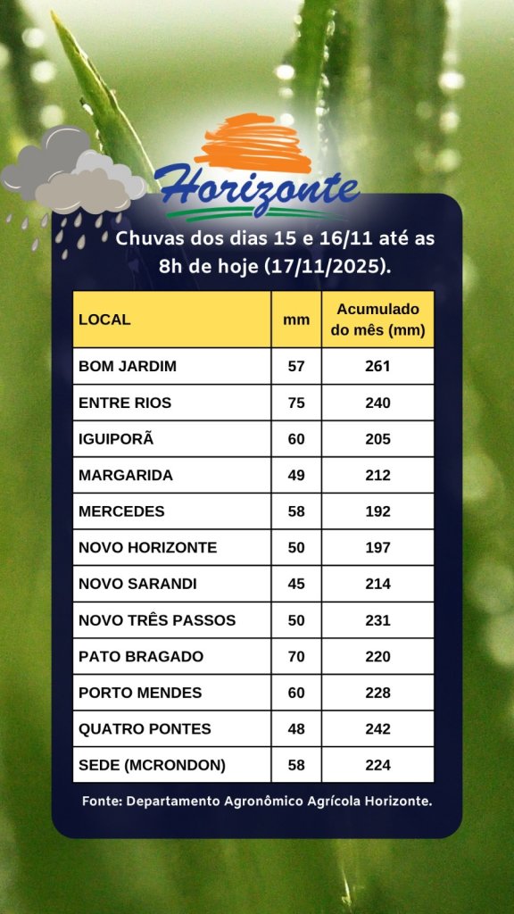 2025 — É domingo. O amanhecer na cidade de Marechal Cândido Rondon (PR) tem temperatura de 21 graus. Ventos do quadrante Norte, fracos, persistentes até o coemço da noite. Céu encoberto com nebulosidade tipificada como stratus. Nâo chove durante o dia. Ocorrem precipitações pluviométricas no começo da noite, com a chegada de uma frente fria. As chuvas se estendem até o começo da manhã do dia seguinte.
