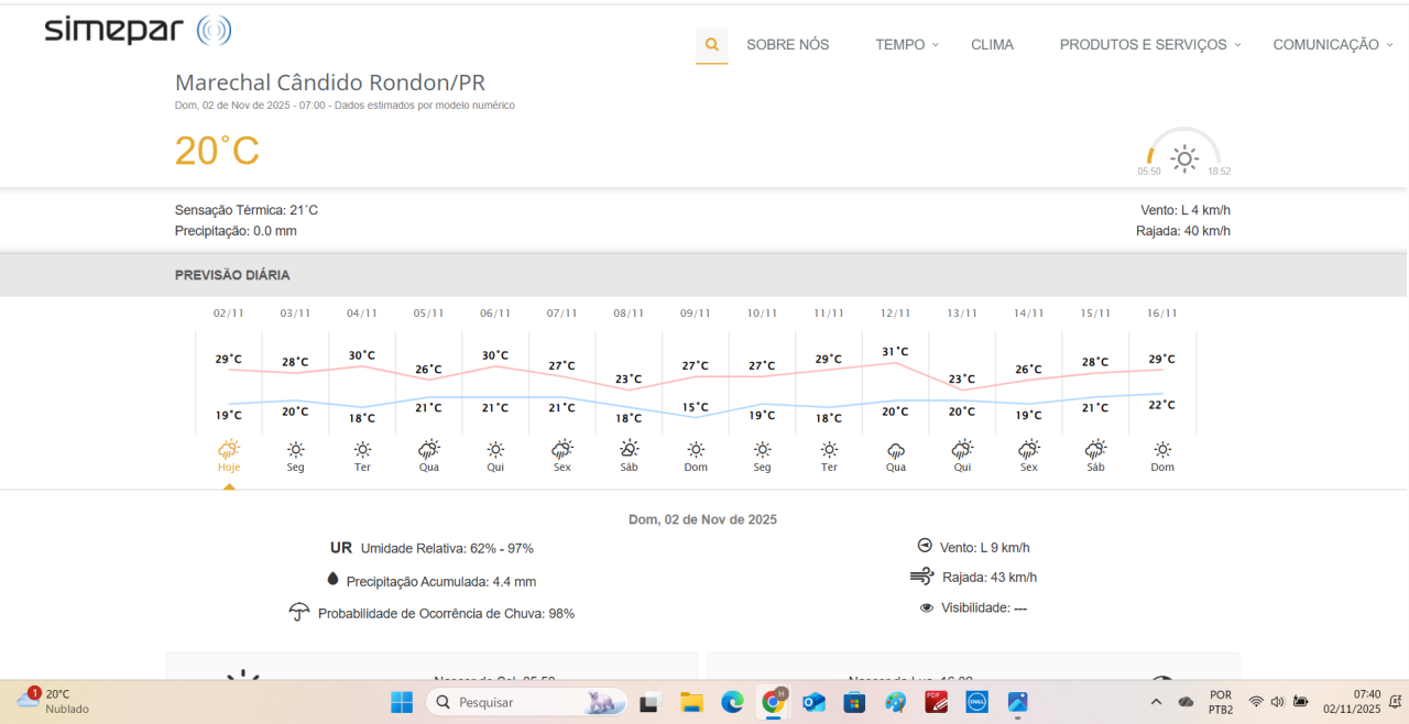 || Previsão meteorológica para a cidade de Marechal Cândido Rondon, 02 de novembro de 2025 e dias supervenientes, fornecida pelo Simepar - FOTO 11 -