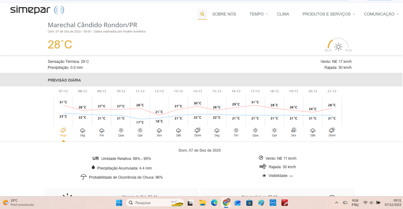 2025 — É domingo. O amanhecer na cidade de Marechal Cândido Rondon (PR) tem temperatura de 23 graus. Ventos do quadrante Nordeste, fracos, persistentes até o começo do final do dia. Céu parcialmente encoberto com nebulosidades tipificadas como cirrus e altocumulus. À tarde, presença de formações de nuvens tipo cumulonimbus. Ocorrem precipitações pluviométricas na cidade e no interior do municiípio.