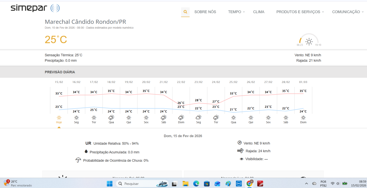 2026 — É domingo. O começo da manhã na cidade de Marechal Cândido Rondon (PR) tem temperatura de 24 graus. Ventos do quadrante Nordeste, fracos, persistentes aé o começo do final da tarde. Céu parcialmente encoberto com nebulosidades tipificadas como altocumulus e cirrostratus. À tarde, também avistamento de formações de nuvens cumulonimbus. Ocorrem precipitações pluviométricas de distribuição espacial irregular, de intensidade variável e de curta duração na região do Oeste do Paraná.