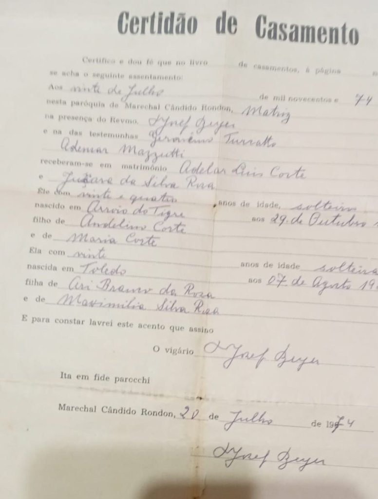 1974 — Casam-se os jovens rondonenses Juçara da Rosa e Adelar Luís Corte¹, na Igreja Matria Sagrado Coração de Jesus, de Marechal Cândido Rondon (PR). A celebração religiosa do matrimônio é oficiada pelo padre Aloisio José Berger.