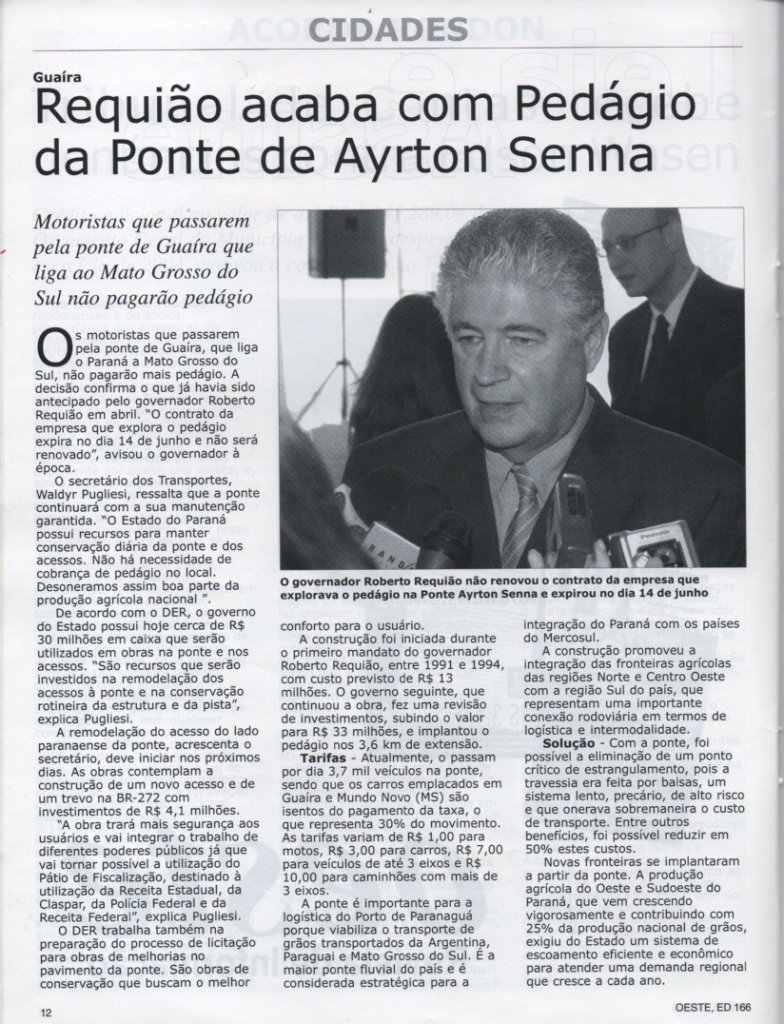 Requião promete manter¹ a ponte em todas as condições com recursos próprios do Estado (Oeste Revista de Informação. Requião acaba com pedágio da Ponte Ayrton Senna. Cascavel: ano 20, nº 166, ed. jun. 2005, p. 12). -- FOTO 13 --