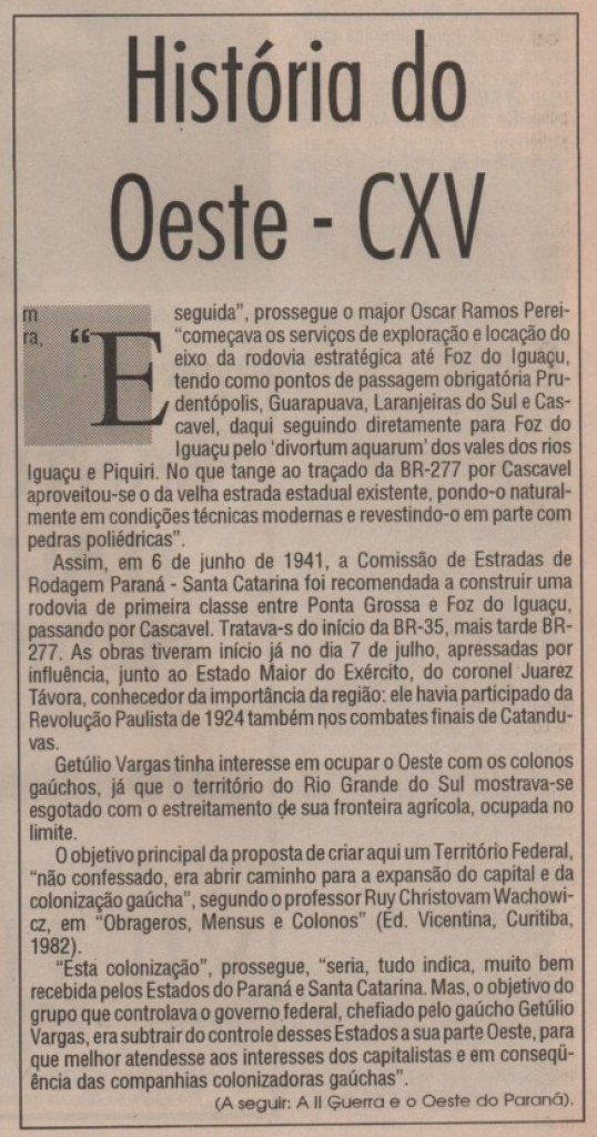 1941 — A Comissão de Estradas de Rodogem Paraná - Santa Catarina recebe recomendação para "construir uma rodovia de primeira classe entre Ponta Grossa e Foz do Iguaçu", passando pela cidade de Cascavel. Na época, a via ficou ganhou a denominação de BR 35. Anos depois, passa a ser chamada oficialment de BR 277 (O Paraná. História do Oeste do Paraná. Cascavel: Variedades - Máquina do Tempo, ed. 17 jan. 1999, p. 26). -- FOTOS 3 e 4 --