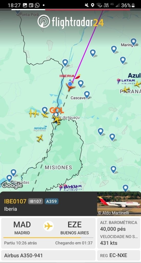 Imagem: Acervo Flightradar - FOTO 26|| Identificação da rota da aeronave da Iberia que cruzou o espaço aéreo de Marechal Cândido Rondon, no final da tarde de 05 de outubro de 2025.
