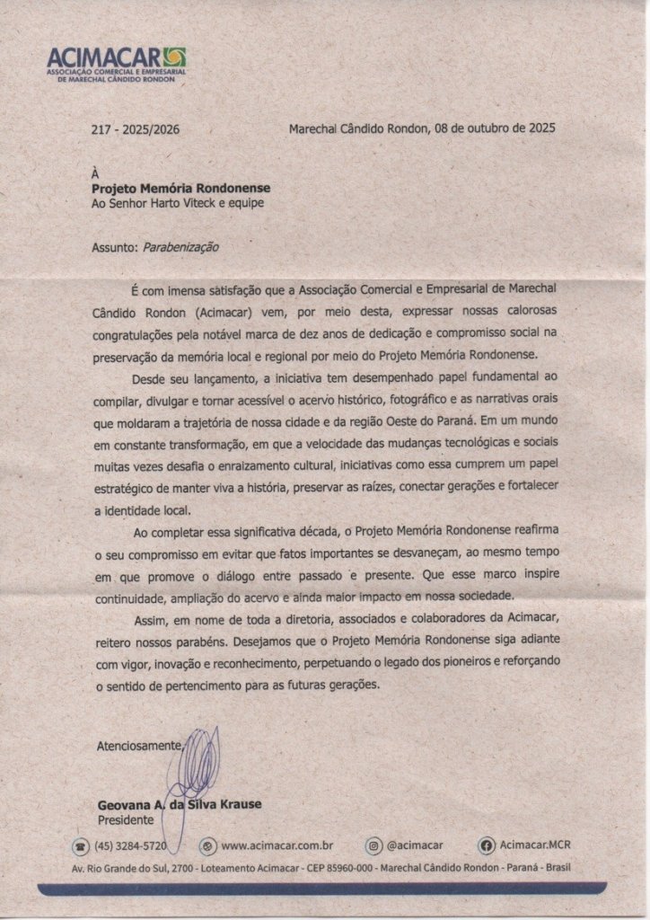 2025 — A Associação Comercial e Empresarial de Marechal Cândido Rondon (ACIMACAR) formula saudação à equipe do Projeto Memória Rondonense - Oeste Paranaense pelo transcurso dos 10 anos de existência da proposta de trabalho. -- FOTO 22 --