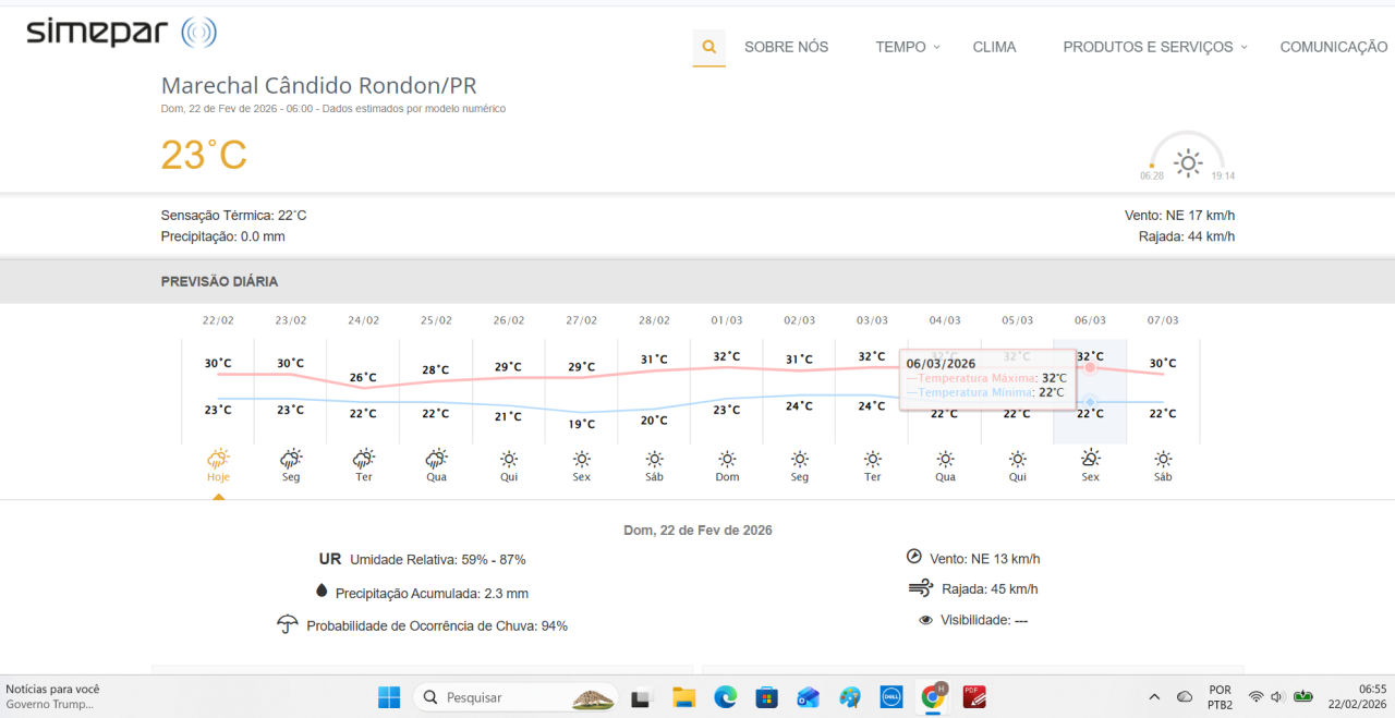 2026 — É domingo. O começo da manhã na cidade de Marechal Cândido Rondon (PR) tem temperatura de 23 graus. Ventos do quadrante Nordeste, fracos, persistentes até o começo do final. Céu parcialmente encoberto com nebulosidade tipificada como altocumulus. No começo da tarde, presença de formações de nuvens tipo cumulus. A partir da meia tarde surgem ao poente nebulosidades tipificadas como cirrostratus e altostratus.
